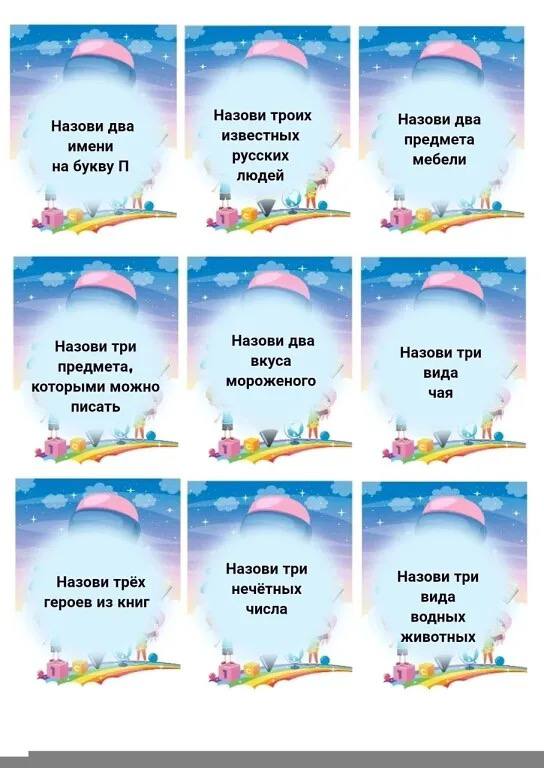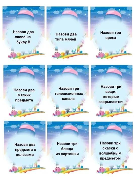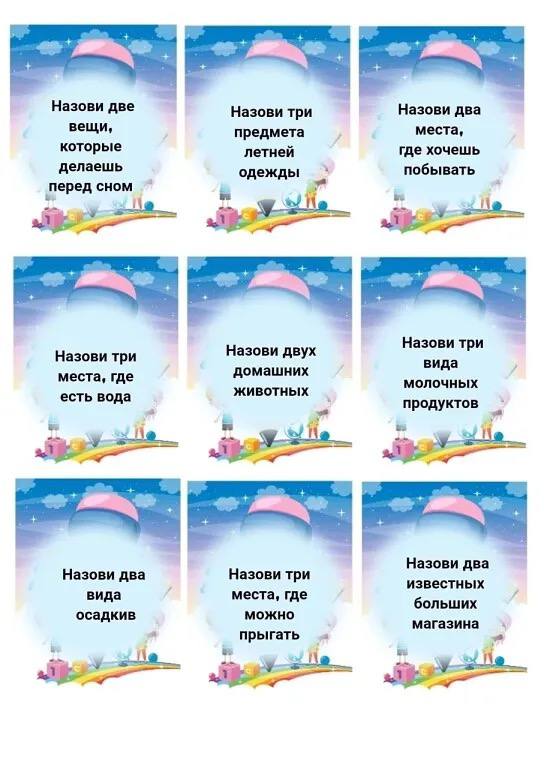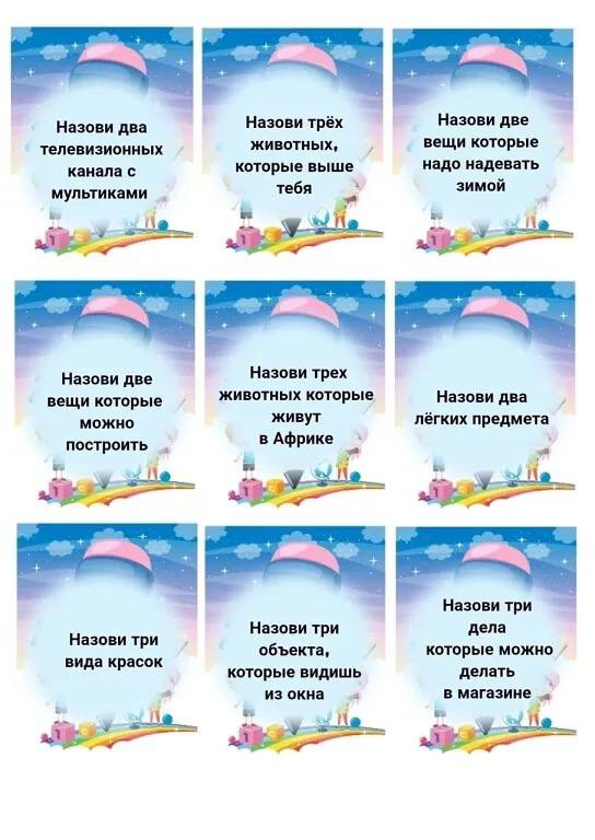 Интересные карточки с заданиями для развития речи у детей дошкольников. Качество – отличное. Для распечатки на листах формата A4. На одном листе 9 карточек. Можно распечатать как на цветном, так и на чёрно-белом принтере.